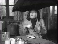 la escena de té con paraguas dentro de casa de Eli (Talfryn Thomas)